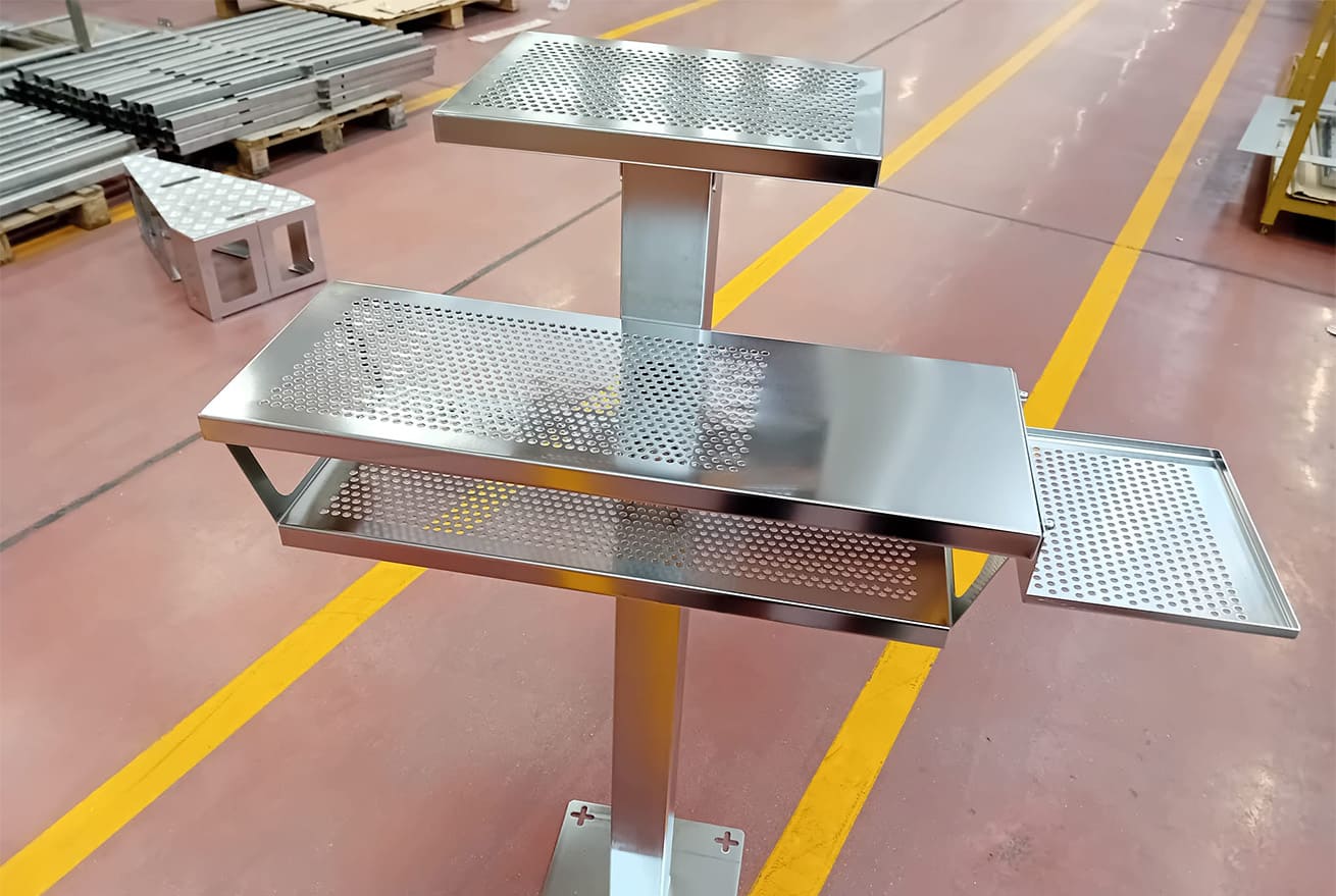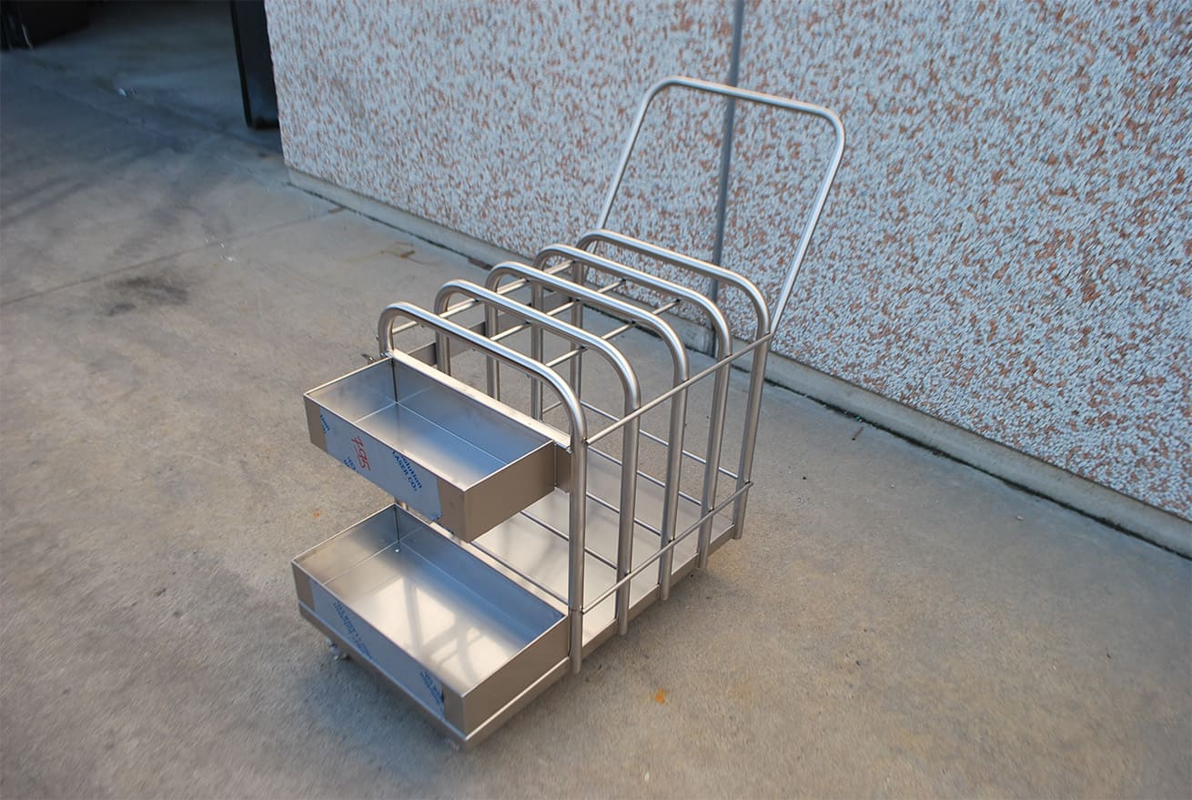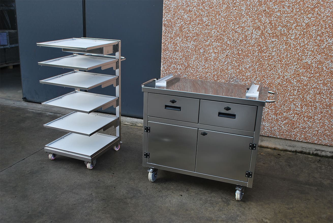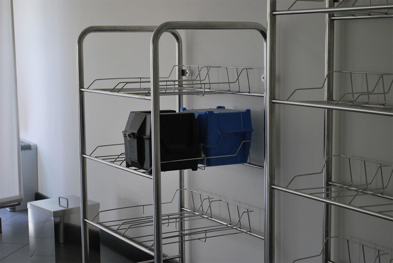 - la gestione delle correnti statiche: poiché le correnti d’aria nelle camere bianche generano correnti statiche sugli oggetti metallici, i nostri prodotti hanno tutti i piani orizzontali forati e ruote antistatiche o piedini regolabili in acciaio inox